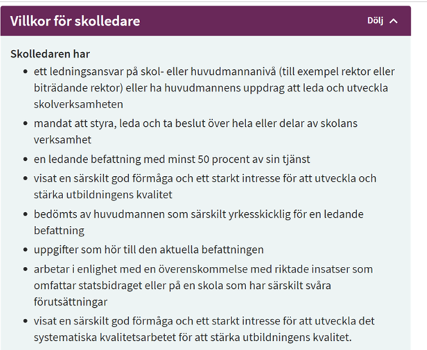 När man har tagit fram kriterierna för skolledare så har man tittat på om skolan har samverkan med skolverket inom ramen för samverkan för bästa skola. Man har även tagit med skolor med många nyanlända samt skolor med särskilt svåra förutsättningar. Villkoren för skolledare är dessa;
