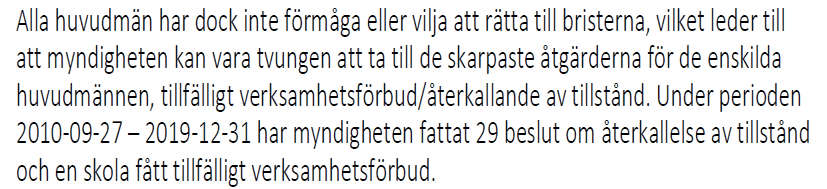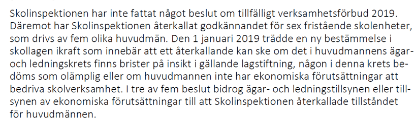 Man har även testat den nya ägarprövningen vilket gjort att några tillstånd har återkallats, till exempel Vetenskapsskolan och Elma School där SI ansåg att huvudmännen inte var lämpliga att bedriva skola. Lite mer om det nedan;