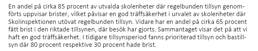 Skolinspektionen har olika former av granskning, dels regelbunden tillsyn, de gör kvalitetsgranskningar, de genomför etableringskontroller och en del annat. De gör rätt många granskningar per år. Mer om det lite längre ner. Frågan är, blir skolorna bättre för att SI kommer och granskar? Blir utbildningen bättre för eleverna eller är det så att skolorna blir bättre på dokumentation och att ha rätt dokumentation? Det behöver vi fundera på. Om SI kommer en gång vart fjärde år så säger det ingenting faktiskt.