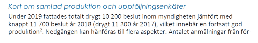 Antalet beslut minskar, men det har också med att de arbetar med andra former av granskning och på ett annat sätt än tidigare. Det kommer dock en hel del anmälningar. Det här är ett stort problem i Sverige, anmälningskulturen.