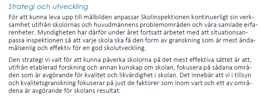 Det spelar ingen roll hur mycket de inspekterar och hur många beslut och rapporter de författar så kommer inte skolor klara av sitt uppdrag – eftersom vi har ett omöjligt uppdrag. De skolor som får grönt ljus av skolinspektionen hade haft den verksamhet de har oavsett inspektion, för att de har förutsättningarna.