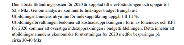 Det hjälper föga att ha en stor budget när indexuppräkningen är 1,1 %. Jag har sagt det många gånger men det tåls att upprepas, nedskärningar är inget nytt. De har pågått i många år med någon procent per år. Nu är vi i ett läge där det inte går att skära ner mer utan att riskera personalens hälsa. Rektorerna/förvaltningen har ett ansvar för att ha budget i balans men det förutsätter att vi får rimliga förutsättningar.