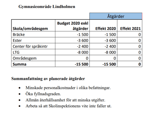 LTG är Lindholmens Tekniska Gymnasium. De ska skära ner 8 miljoner och i handlingsplanen kan man läsa att man ska minska på personalantalet, man ska få in fler elever vilket leder till ökad arbetsbelastning för lärarna, man ska minska inköp och man ska arbeta för att förelägganden om viten från skolinspektionen inte döms ut.