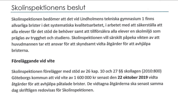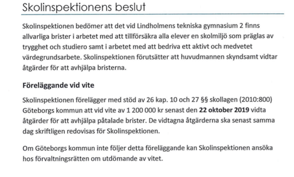 Lindholmens tekniska 1 ska rätta till bristerna senast oktober 2020 annars kan de döma ut ett vite på hiskeliga 2,6 miljoner.