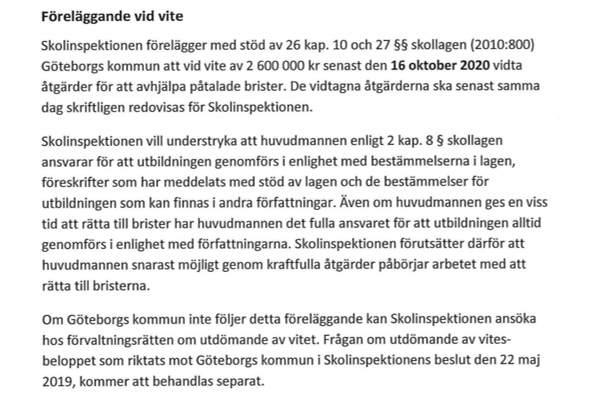 Mellan 2015-2019 hade Göteborgs olika skolnämnder ett hot om vite på 37.450.000 kronor. Allt har inte dömts ut, detta är beslut om föreläggande av vite. Skolinspektionen behöver ansöka hos förvaltningsrätten för att få vitet utdömt.