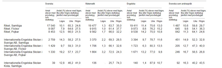 Det är inte konstigt att IES har höga betyg när de. 1: har hög avvikelse mellan betyg och NP, 2: har ett lättundervisat elevunderlag. När jag säger lättundervisat elevunderlag betyder att de har hög andel elever där föräldrarna har eftergymnasial utbildning, de har få nyanlända elever och de har fler flickor än pojkar. Det i kombination med betygsinflation skapar en bild av ”en skola med höga resultat”