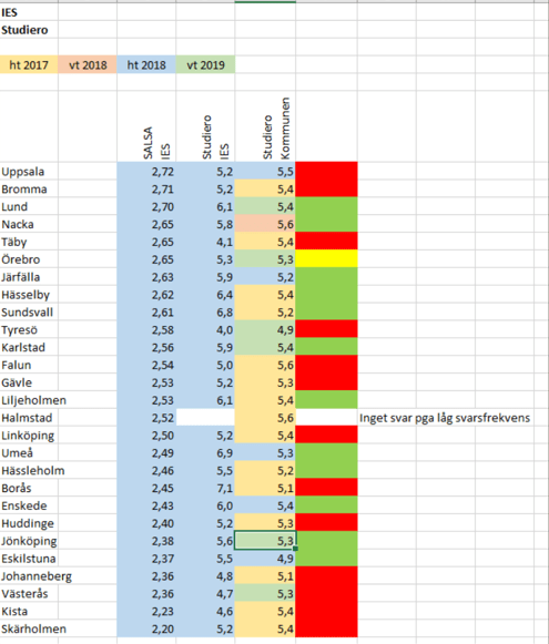 De röda fälten är de skolor där IES inte har fått bättre resultat än jämförbara kommunala skolor.