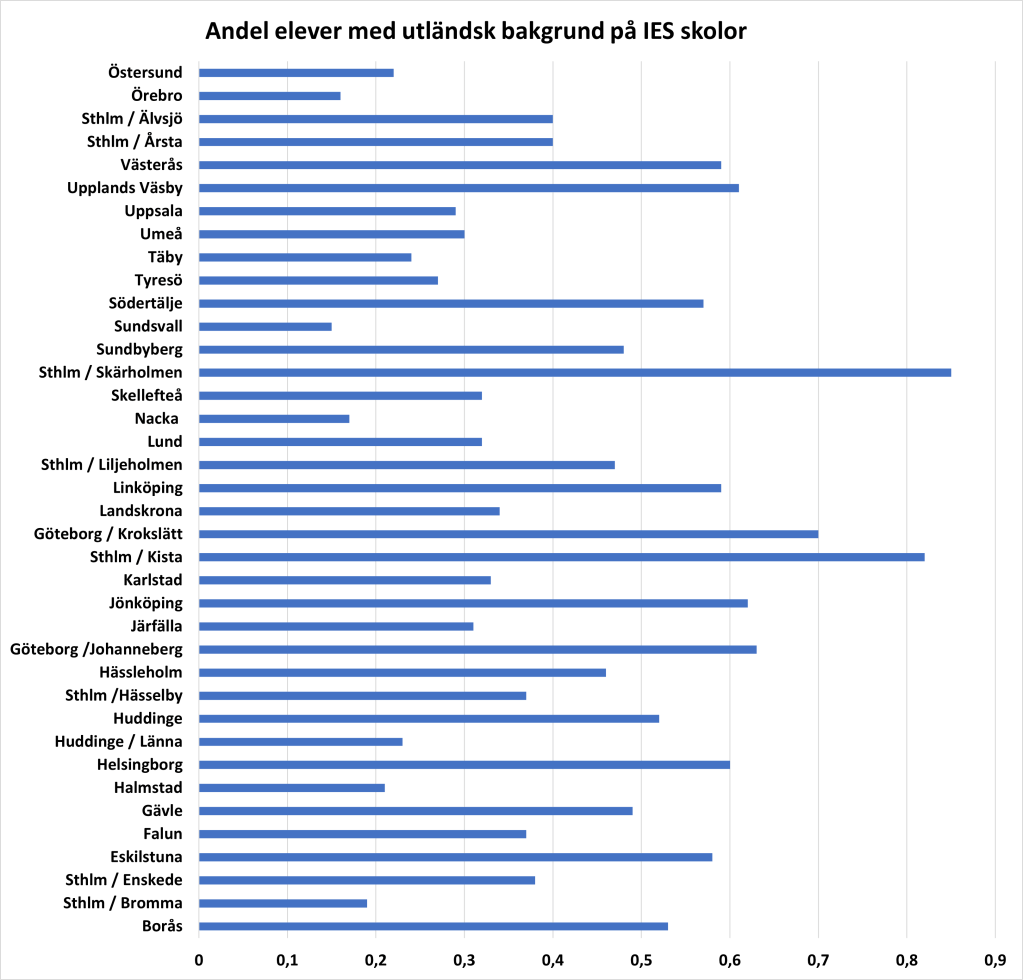 IES har i snitt fler elever med utländsk bakgrund om man jämför med kommunala skolor. Det gäller i flera av de kommuner där IES finns och så ser det ut i riket.