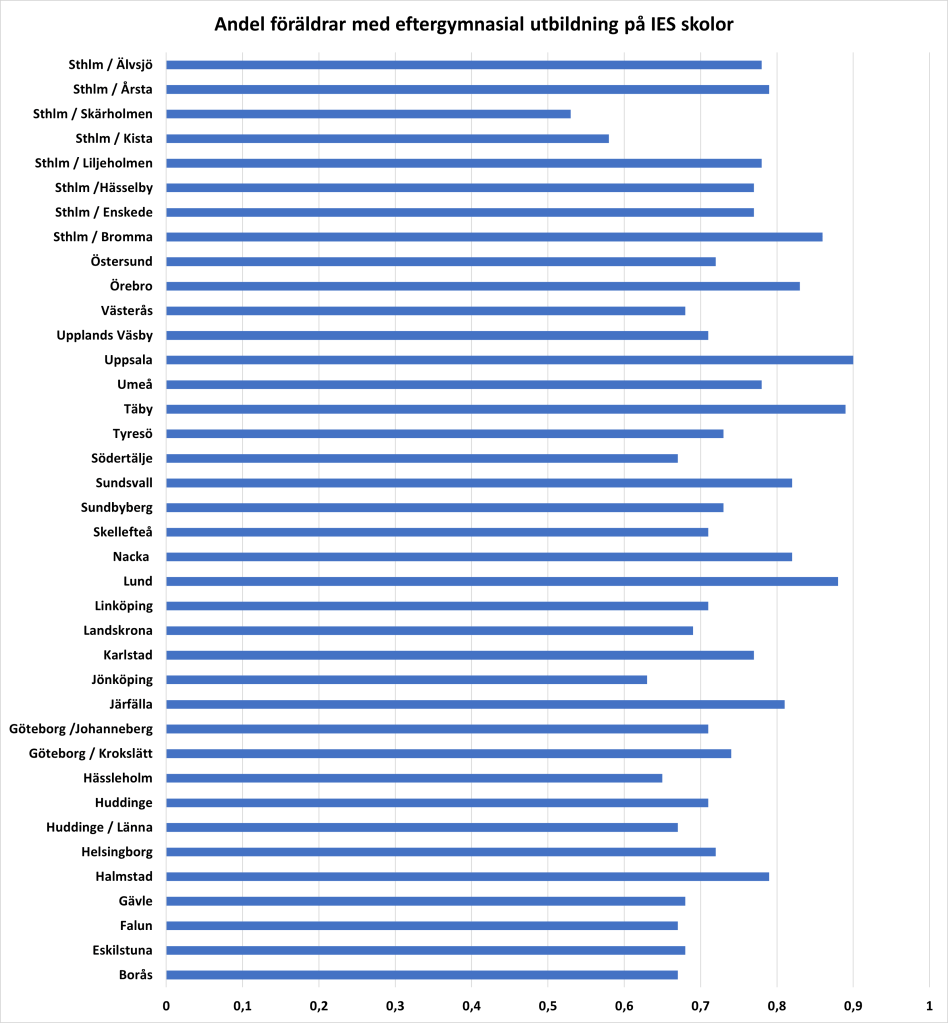 I kommuner kan det skilja väldigt mycket mellan skolor i samma geografiska område/inom kommunen. Även om IES har en ganska hög andel elever med utländsk bakgrund har de främst elever som har föräldrar med eftergymnasial utbildning – även bland de elever som har utländsk bakgrund. Som alla känner till vid det här laget är det den främsta faktorn som påverkar skolresultaten.