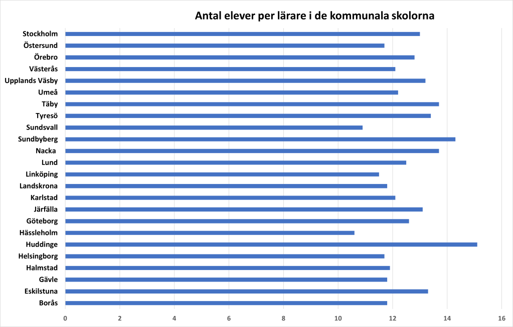 I de kommunala skolorna går det i snitt 12,0 elever per lärare och hos enskilda huvudmän är det i snitt 13,2 elever per lärare.