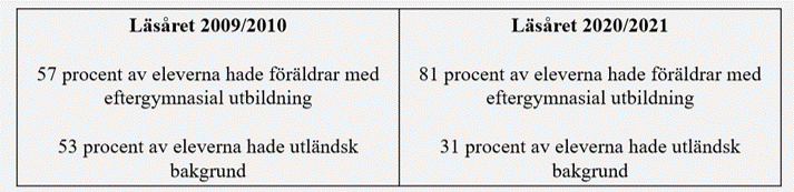 I kommunens skolor är det generellt lägre andel elever som har föräldrar med eftergymnasial utbildning. Det gör att de kommunala skolorna har ett svårare uppdrag eftersom elever som inte kommer från akademiska hem behöver mer stöd för att klara skolan. De är dyrare att undervisa och man kan inte ha lika många elever per klass.