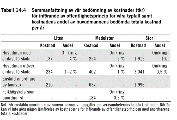 Kunskapsskolan skriver i sitt remissvar på utredningen att de beräknar att offentlighetsprincipen kommer att kosta dem 23 miljoner kronor. Det skulle innebära 38 tjänster om årslönen är 600 000 kronor. Koncernen omsätter ca 1,6 miljarder kronor. Det skulle alltså innebära att de tror att de kommer lämna ut 1140 handlingar per dag, om alla 38 arbetar heltid. Det tar max 15 min att lämna ut en handling i en skola inklusive sekretessprövning.